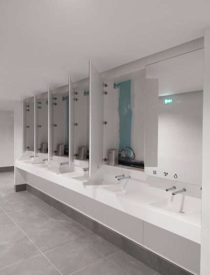 Dans les sanitaires collectifs à forte fréquentation, le choix du matériau est déterminant. Certains matériaux vieillissent mal, se fissurent ou perdent leur aspect esthétique. Les plans vasques collectifs en résine de synthèse offrent une excellente résistance aux chocs, à l’humidité et aux produits d’entretien, tout en assurant une stabilité esthétique dans le temps. Un choix stratégique pour les collectivités et maîtres d’ouvrage.