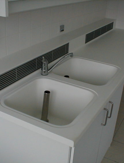 La résine de synthèse (Krion®, Corian®, Varicor®) s’impose comme un matériau de référence pour la réalisation de paillasses sur mesure ou standardisée, grâce à ses propriétés de résistance, sa facilité d’entretien et sa conformité aux normes.