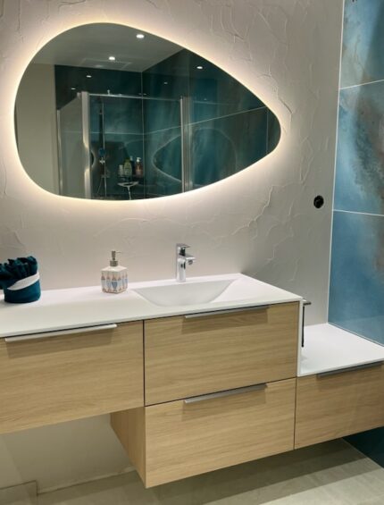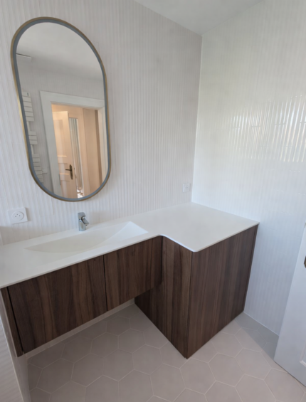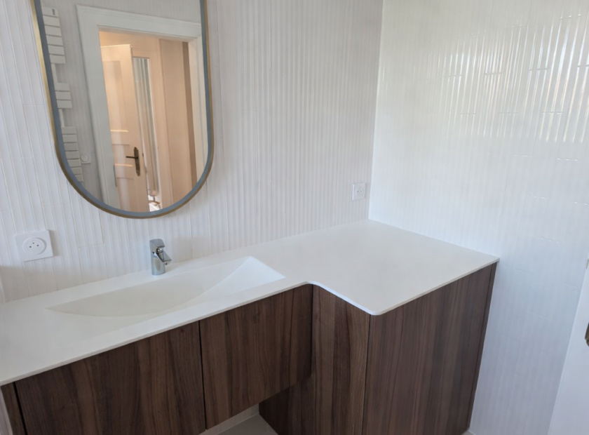 Un plan vasque sur mesure en solid surface s’adapte précisément à l’espace disponible. Contrairement aux meubles standards nécessitant des ajustements ou des compromis esthétiques, le sur-mesure optimise chaque centimètre. Résultat : une finition haut de gamme, une meilleure longévité et une valorisation immédiate du bien immobilier.